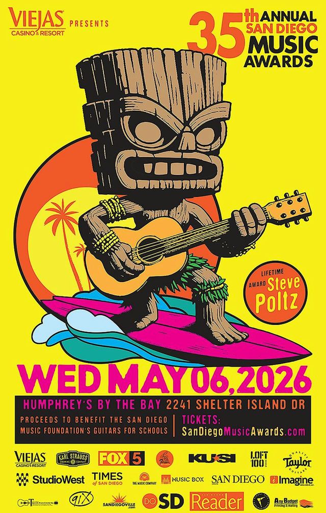 The 35th annual San Diego Music Awards are set to take place on Wednesday, May 6 at Humphreys by the Bay. Awards will be presented in 27 categories! Doors open at 6pm, showtime is 7pm.