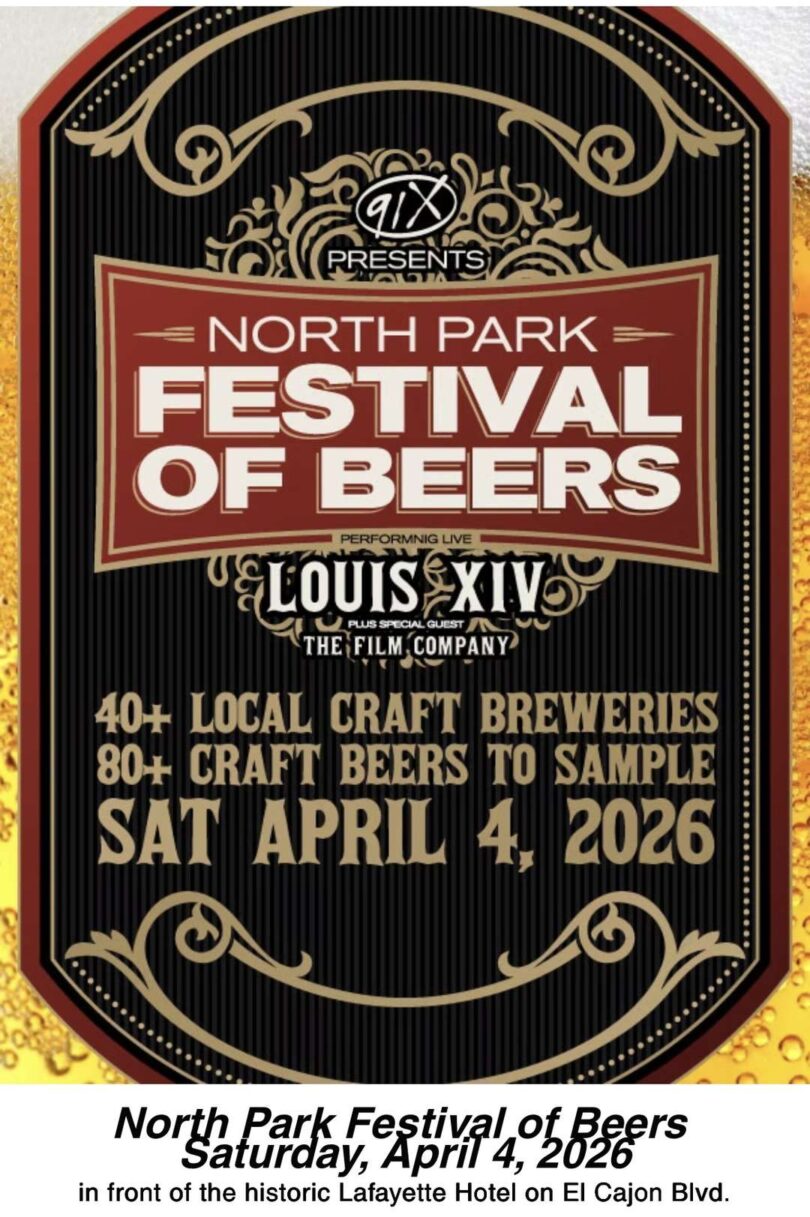 Radio Station 91X is bringing back their amazing North Park Festival of Beers! The event happens April 4, from 12-4pm in front of the historic Lafayette Hotel on El Cajon Blvd, San Diego. There will be lots of beer, food, live music by Louis XlV plus special guest The Film Company, and street vendors.