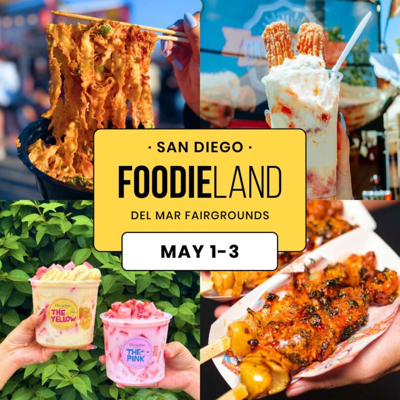 FoodieLand Food Festival in Del Mar is a national food festival, filled with 200+ vendors with global flavors, artisan shops, games, and live music. FoodieLand runs from May 1-3, and is open to the public from 3pm  to 10pm, at the Del Mar Fairgrounds.