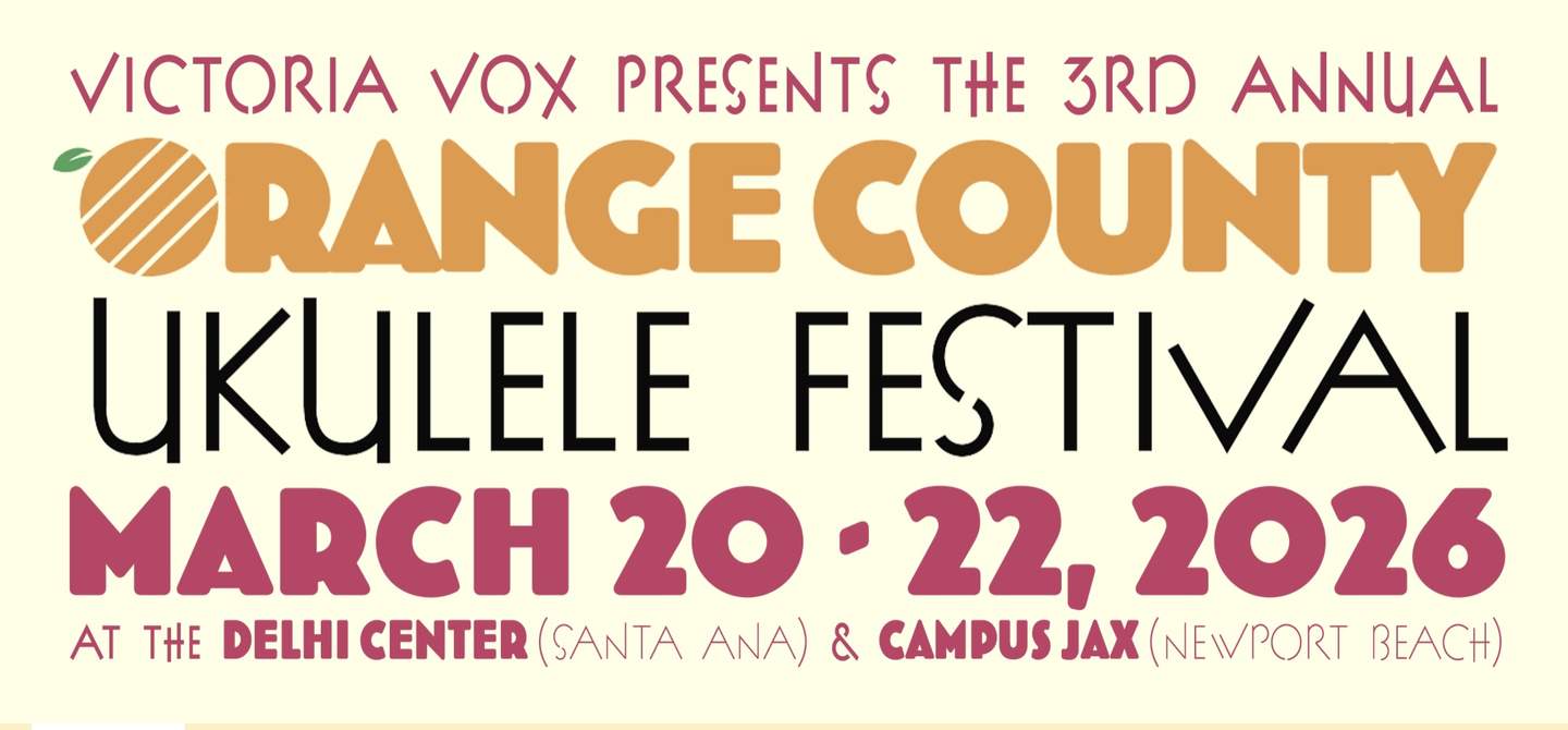 The Orange County Ukulele Festival, commonly known as the OC Uke Fest, will hold its 3rd annual event over three days: March 20-22, 2026. The 2026 OC Uke Fest takes place in Santa Ana and Newport Beach, in Southern California, near the SNA (Orange County) Airport. The OC Uke Fest ukulele gathering celebrates our favorite four-stringed instrument by offering Ukulele Workshops, Guest Artist Performances, a Ukulele Open Mic, Group Ukulele Jams, a free Raffle, and Silent Auction.