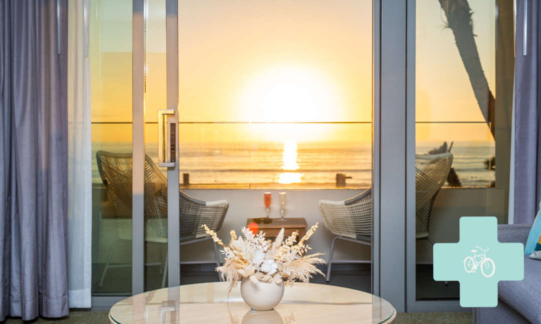 Reserve a room with a view of the famed Pacific Beach Crystal Pier with surfers waiting and catching some nicely formed waves. Your king or queen beds come with a set of fitted sheets and two sets of top sheets with a white down blanket on top. Sink into the comfortable mattress and rest your head on the pure white feather pillows. Rooms are private and quiet and many have balcony ocean views.